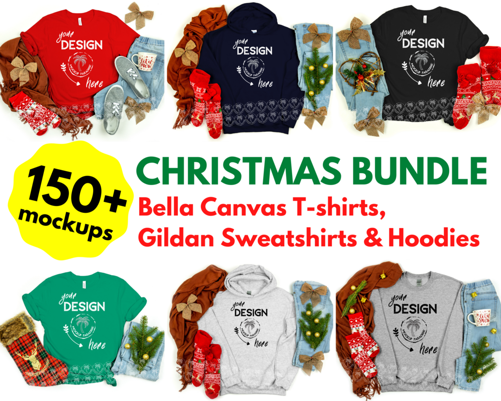 Christmas Mockup Bundle - Bella Canvas 3001, Gildan 18000 Sweatshirt, Gildan 18000 Hoodie Mockups